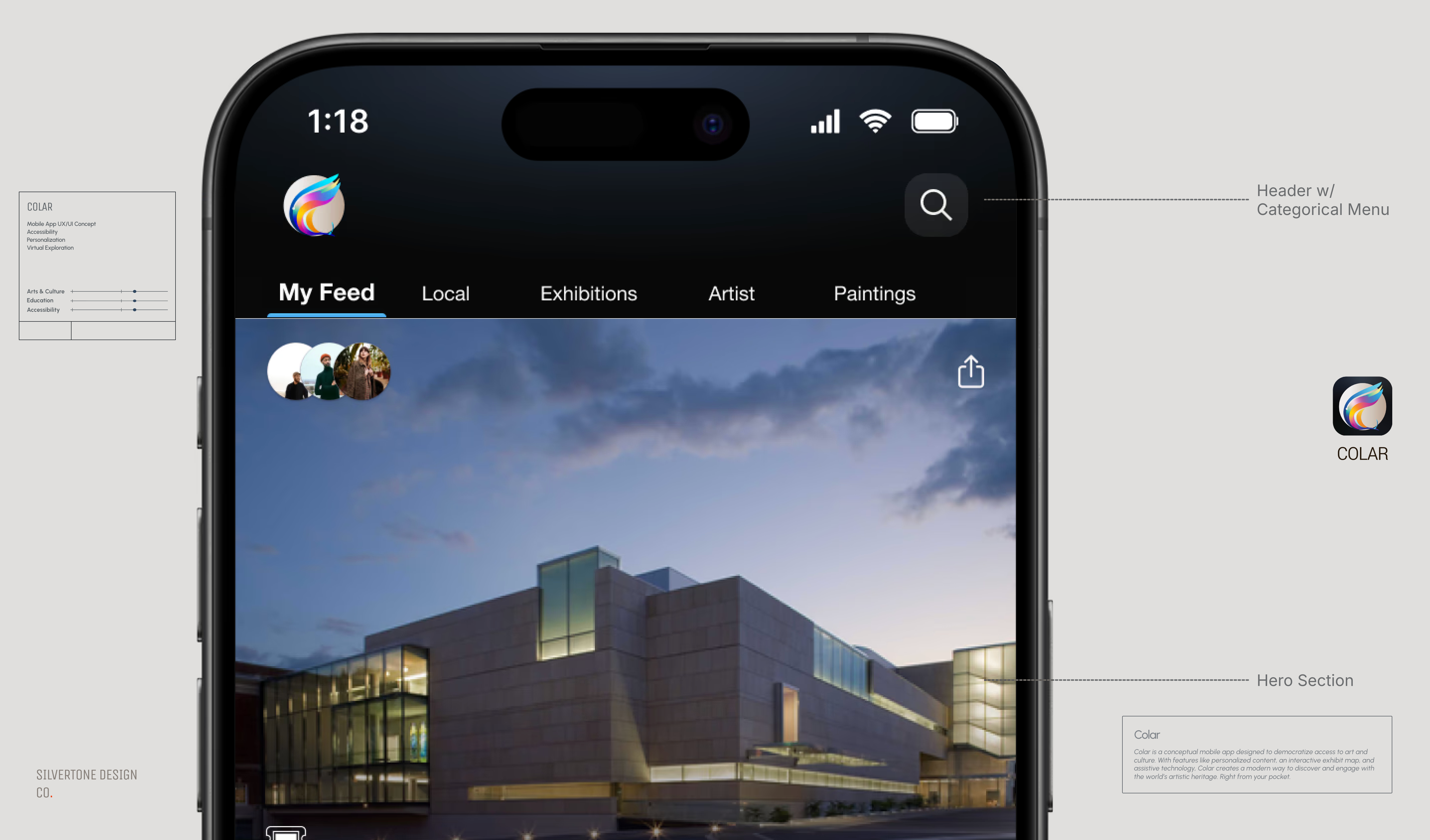 Colar is a conceptual mobile app designed to democratize access to art and culture. Built for inclusivity, Colar allows users to explore exhibits, read personalized articles, and experience virtual museum tours, all from their mobile devices. The app emphasizes accessibility by integrating assistive technology and offers an experience that evolves based on each user's interests and behavior.